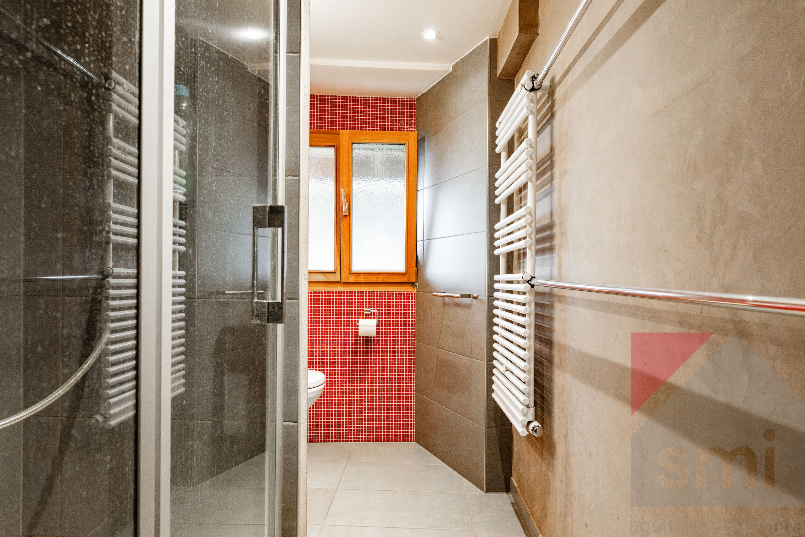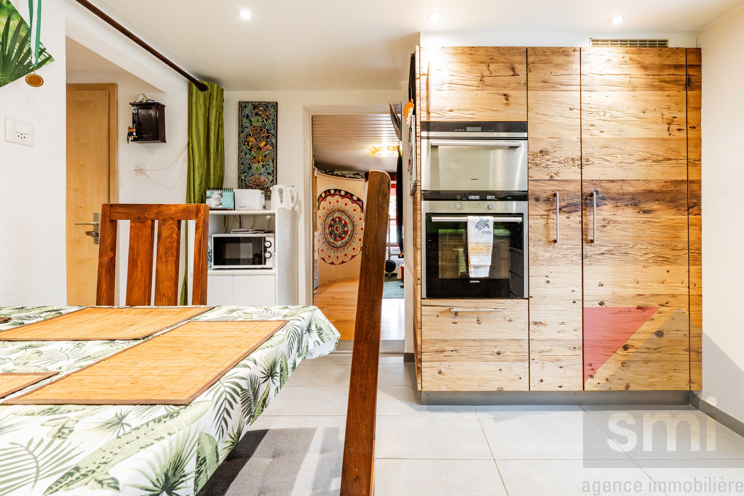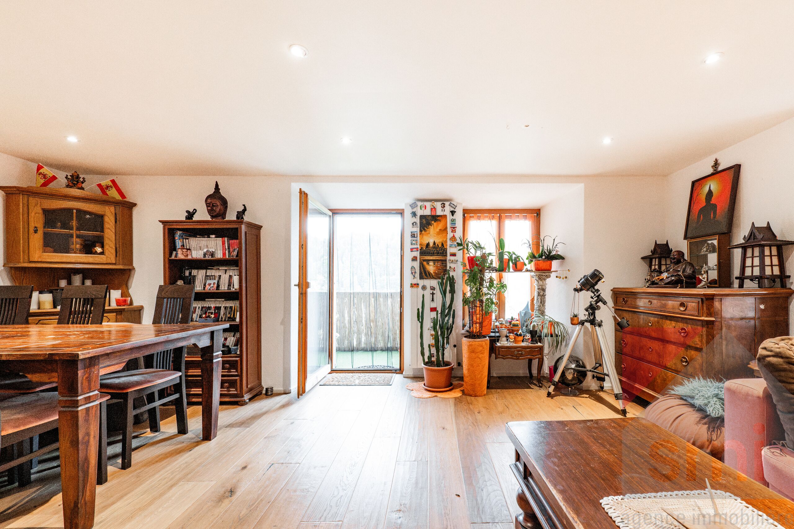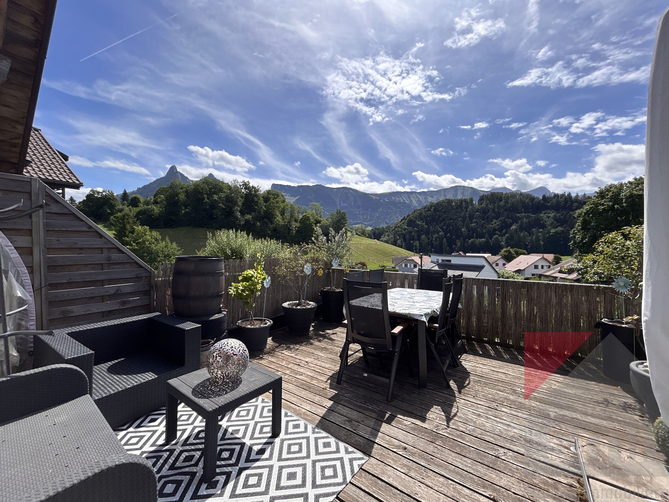 From the entrance, you discover a warm and perfectly equipped kitchen, extended by a multi-purpose room that can be used as an office, workshop or bedroom. On the opposite side, a vast living room opens onto a covered balcony, which in turn gives access to a 27 m² private terrace, with a panoramic view of the Pre-Alps, without overlooking.