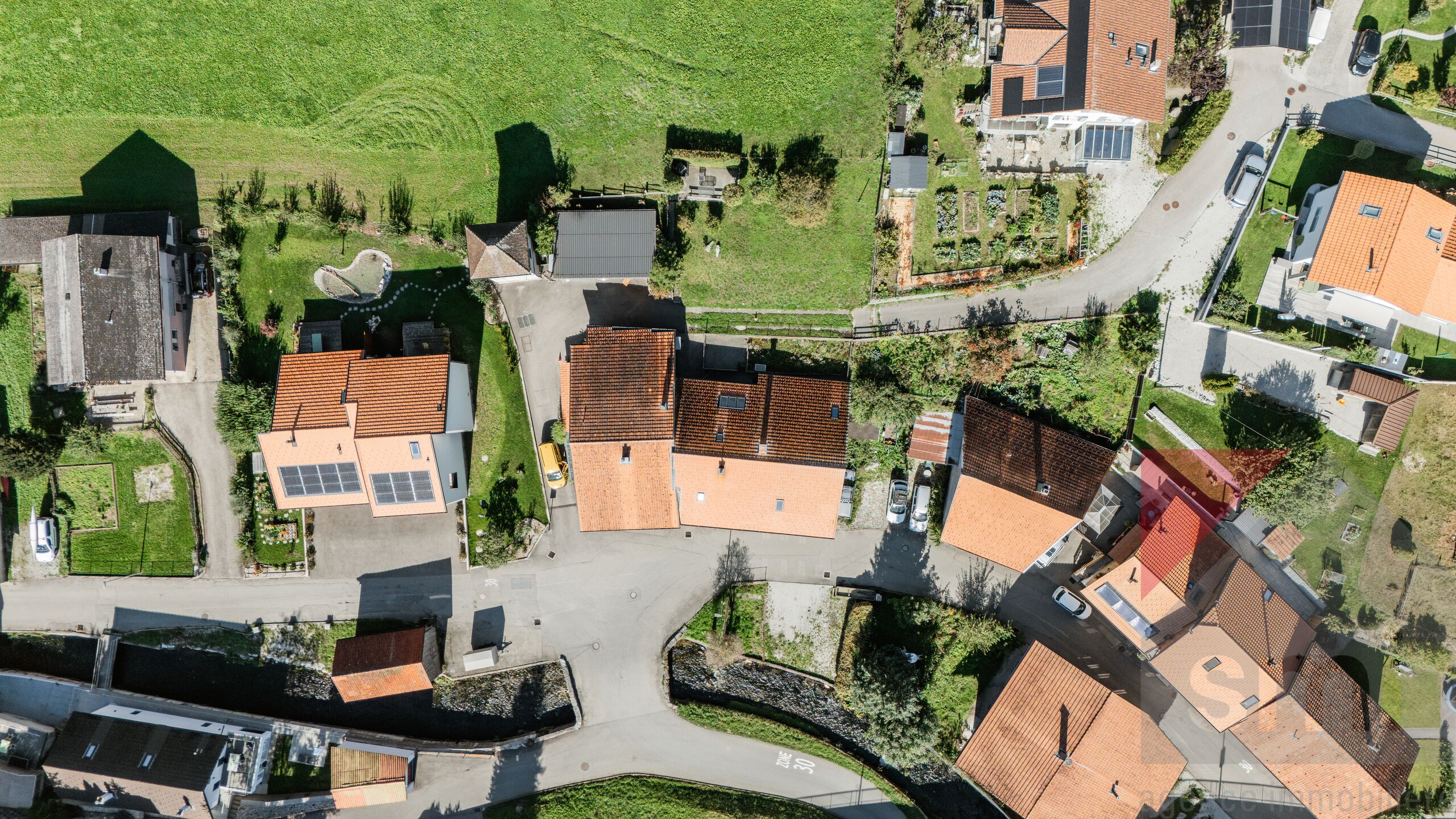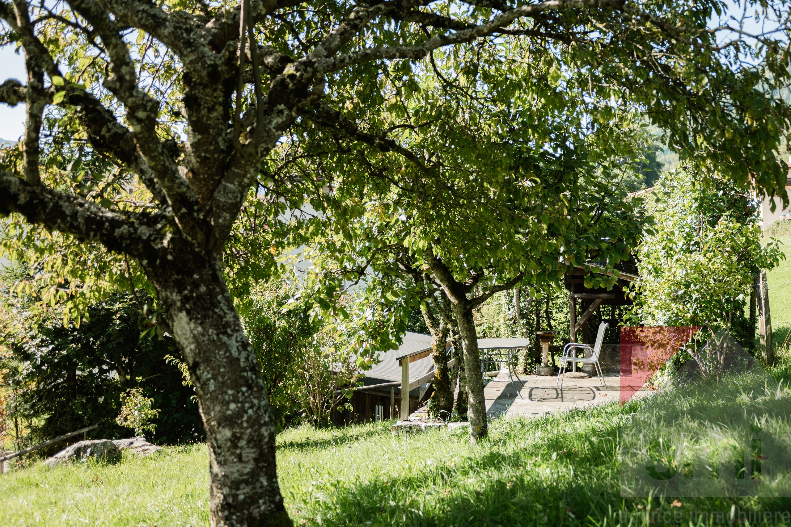 Une jolie terrasse à l'ouest peut être utilisée même par temps de pluie, puisqu'elle est entièrement abritée, et des espaces de jardin en surplomb de la maison permettent de profiter d'une belle vue sur les Préalpes.