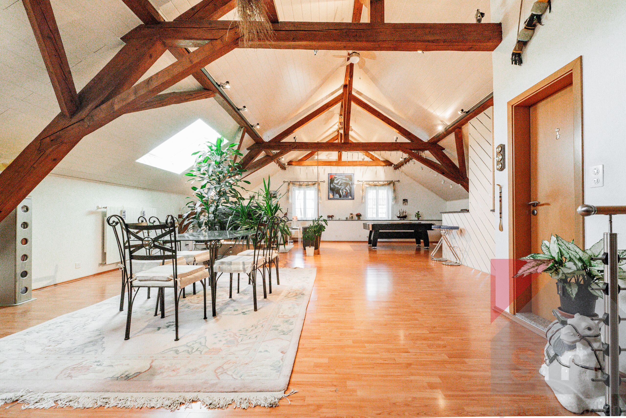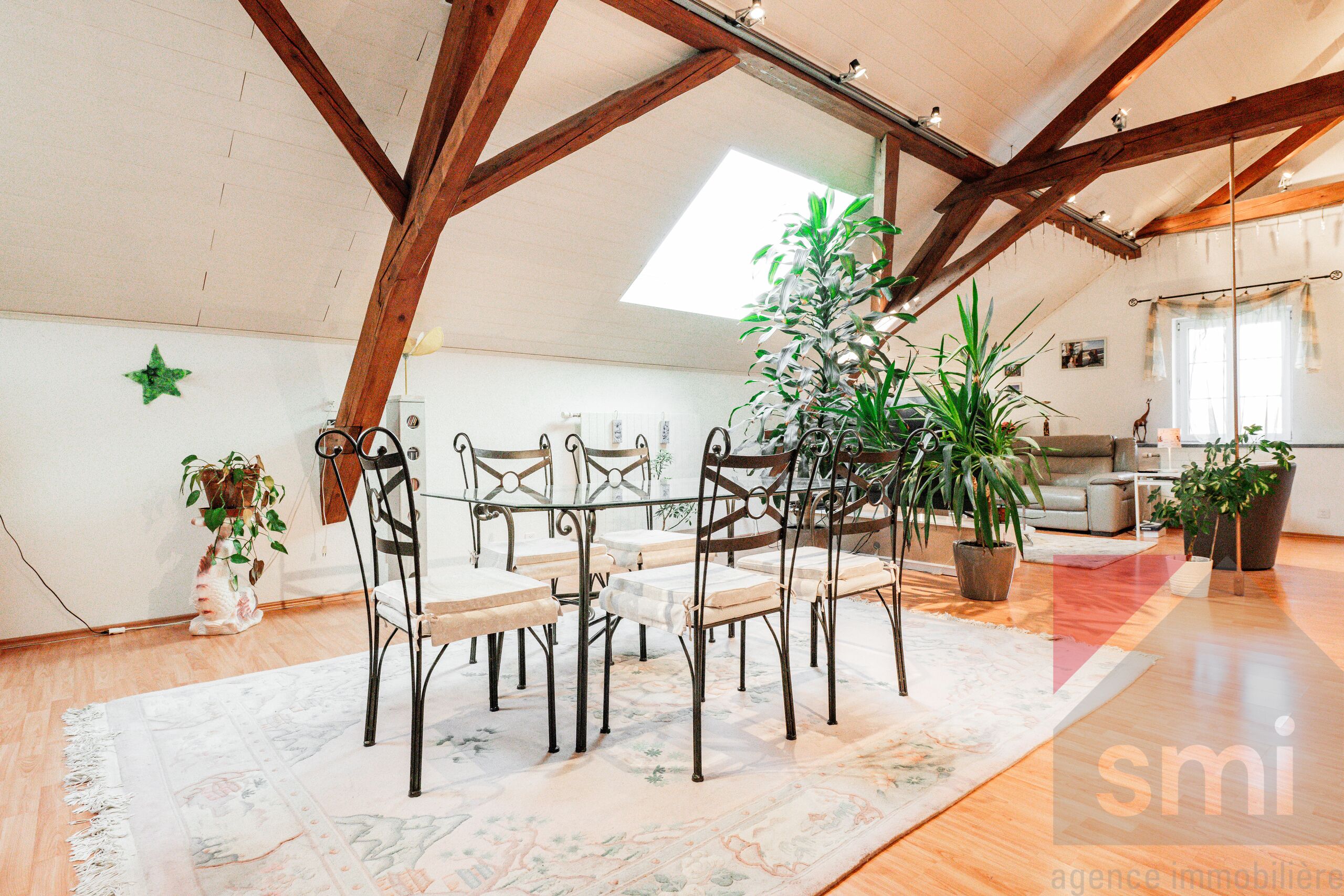 Le logement principal s’étend sur deux niveaux, au premier étage et dans les combles. Ce duplex de 6 pièces offre un charme remarquable avec ses poutres apparentes et sa hauteur sous plafond qui apporte une sensation d’espace rare.